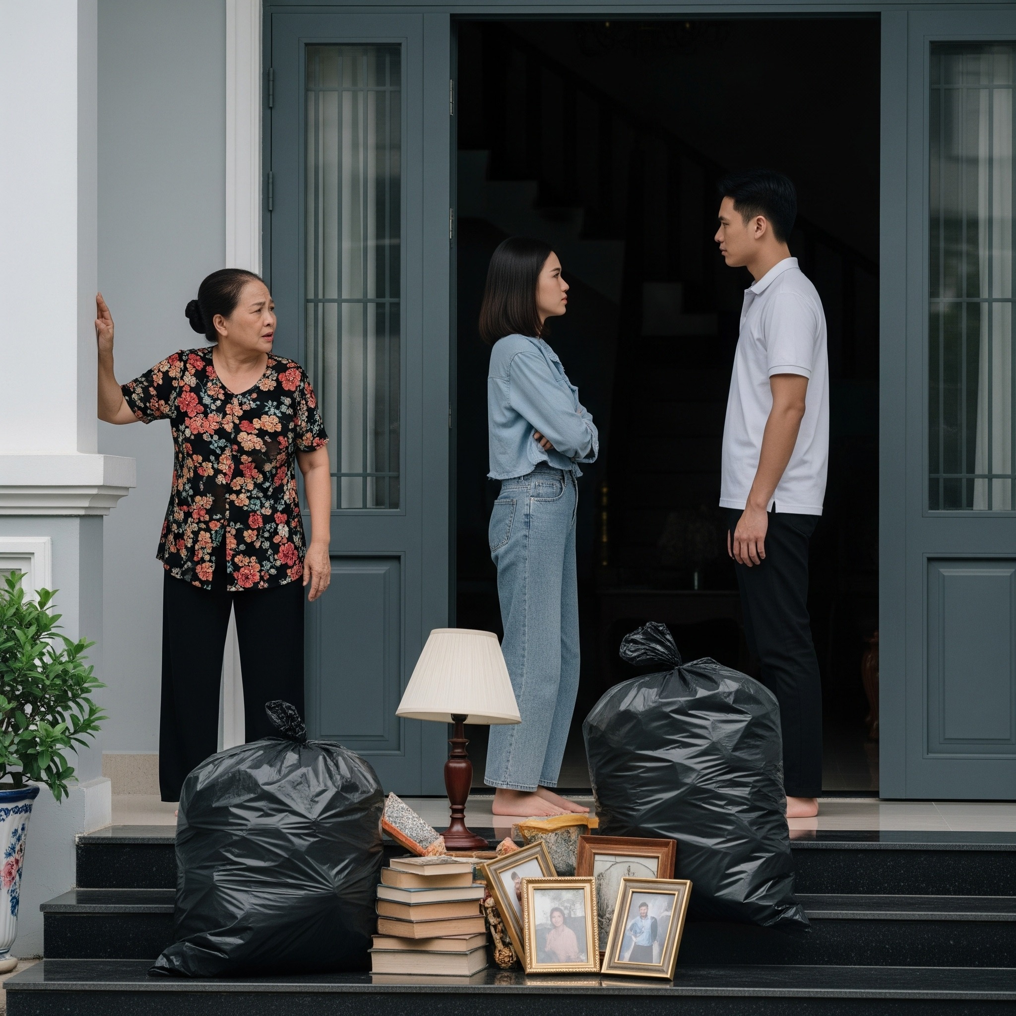 Tối đó, bà thu dọn đồ, định lặng lẽ đi. Nhưng khi vừa kéo vali xuống tầng, ông Minh đã đứng sẵn ở cửa.