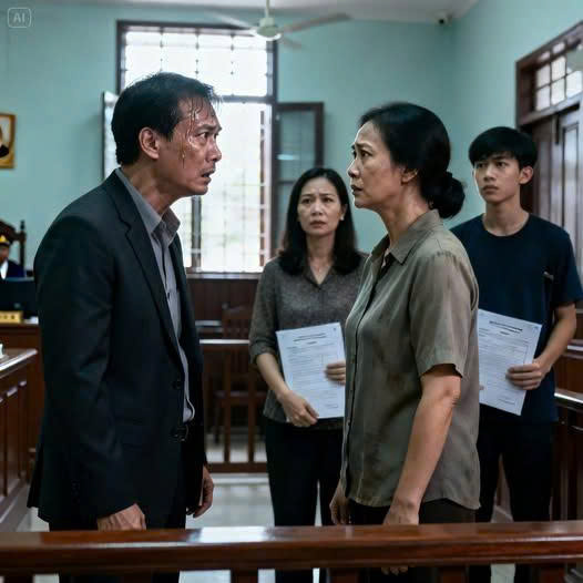 Bên kia hành lang, Nguyễn Văn Minh – chồng cô – ngồi khoanh tay, gương mặt lạnh băng. Anh ta trẻ hơn Hạnh bốn tuổi, tóc vuốt keo gọn gàng, áo vest thẳng nếp. Khi Hạnh bước vào phòng xử, Minh cười nhạt, nghiêng người nói đủ lớn để cô nghe: