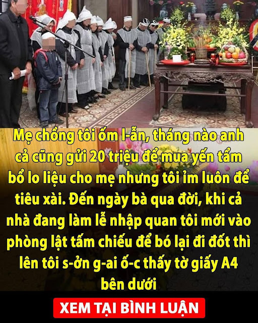 Mẹ chồng tôi ốm l-ẫn, tháng nào anh cả cũng gửi 20 triệu để mua yến tẩm bổ lo liệu cho mẹ nhưng tôi ỉm luôn để tiêu xài. Đến ngày bà qua đời, khi cả nhà đang làm lễ nhập quan tôi mới vào phòng lật tấm chiếu để bó lại đi đốt thì lên tôi s-ởn g-ai ố-c thấy tờ giấy A4 bên dưới