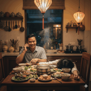 Rồi bác kéo Hương ra mâm ngoài hiên – mâm dành cho họ hàng thân thiết. Mâm tám người, toàn cô chú bác lớn tuổi, chỉ có mỗi Hương là “trẻ con”. Trên mâm la liệt món ngon: heo quay nguyên con bóng nhẫy mỡ, gà ta luộc vàng ươm, tôm sú hấp bia, bò lúc lắc, canh măng sườn, nem công chả phượng… Hương nuốt nước bọt. Sáng nay vội vàng bắt xe sớm, cô chỉ kịp uống vội ly sữa đậu nành, giờ bụng đói cồn cào.